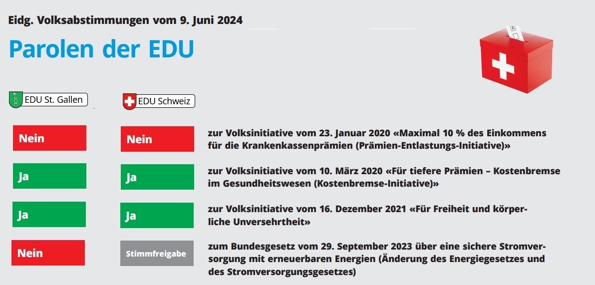 Der Vorstand der EDU Kanton St. Gallen empfiehlt wie die Delegierten der EDU Schweiz ein Nein zu «Maximal 10 % des Einkommens für die Krankenkassenprämien (Prämien-Entlastungs-Initiative)», ebenso eher ein Ja zur Volksinitiative «Für tiefere Prämien – Kostenbremse im Gesundheitswesen (Kostenbremse-Initiative)»